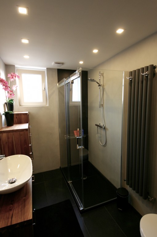 Badkamer, toilet en entree vloer afgewerkt met beal mortex betonlook.