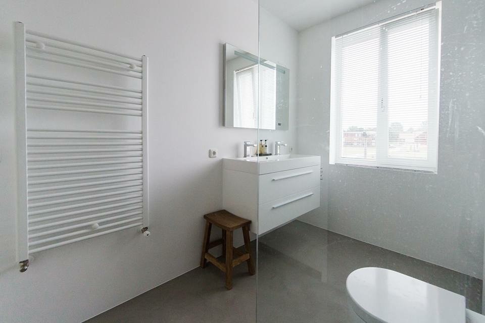 Badkamer, toilet en entree vloer afgewerkt met beal mortex betonlook.