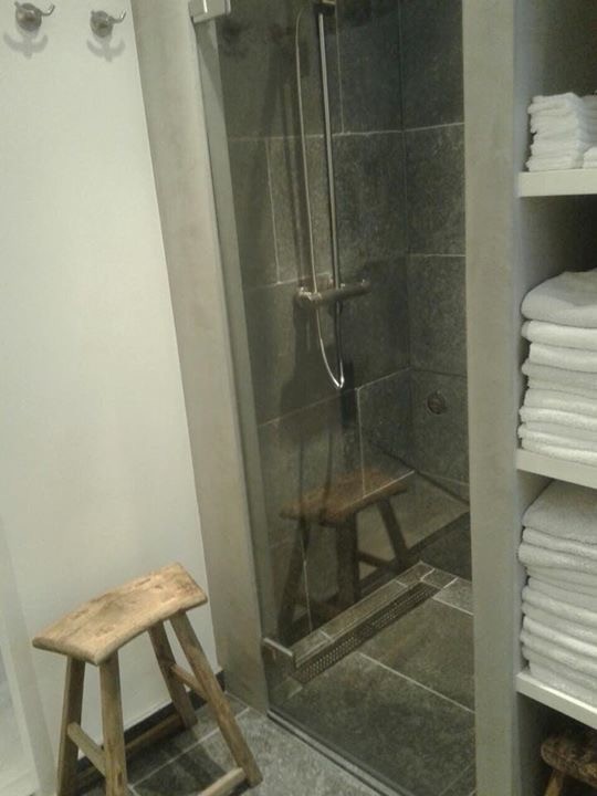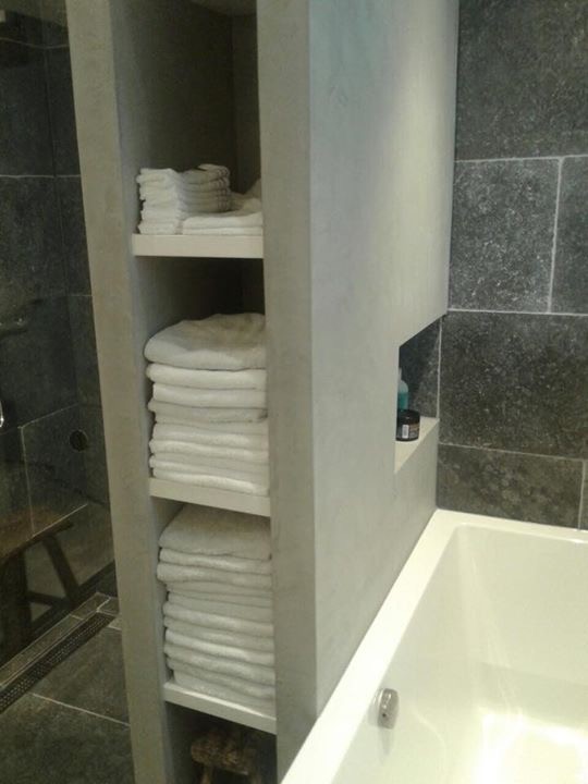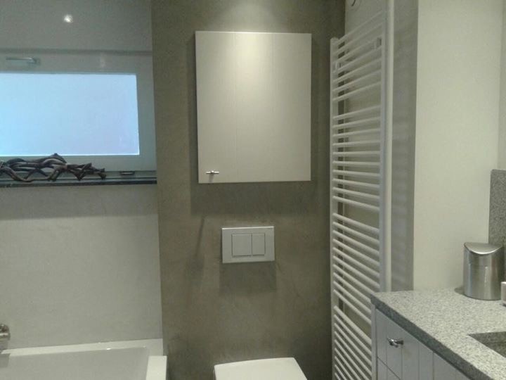 Badkamer, toilet en entree vloer afgewerkt met beal mortex betonlook.