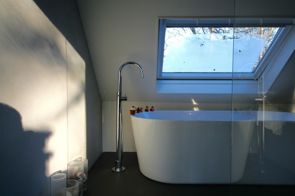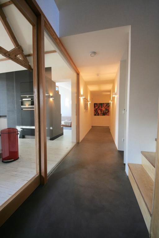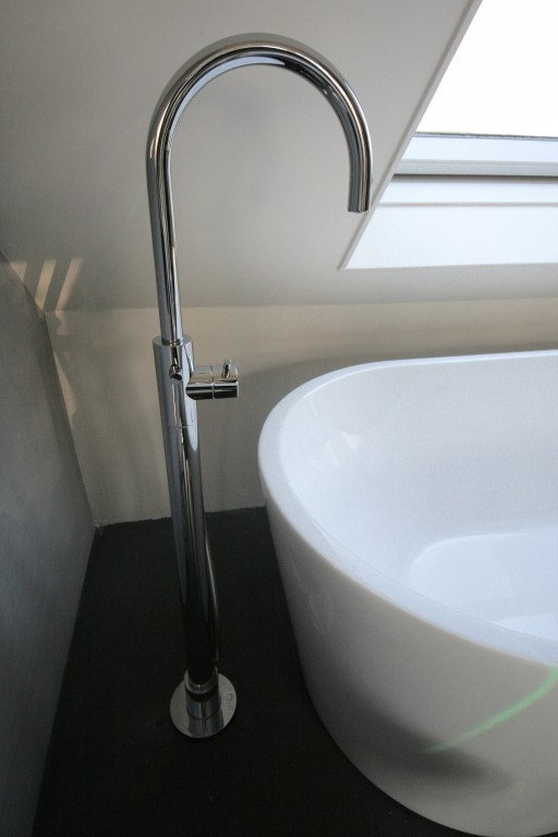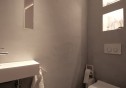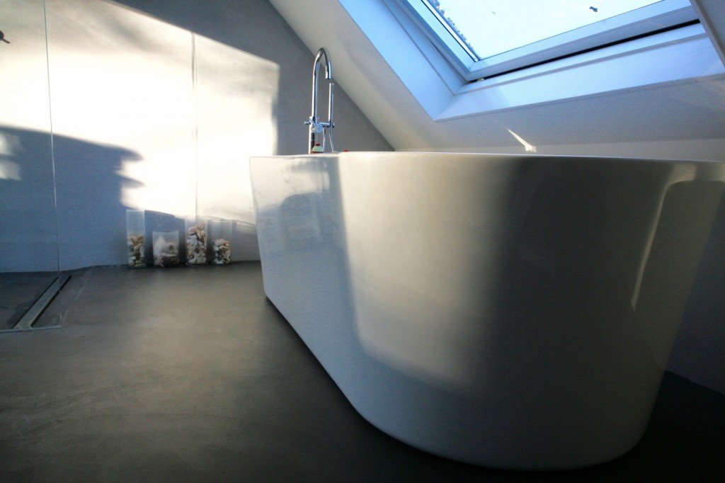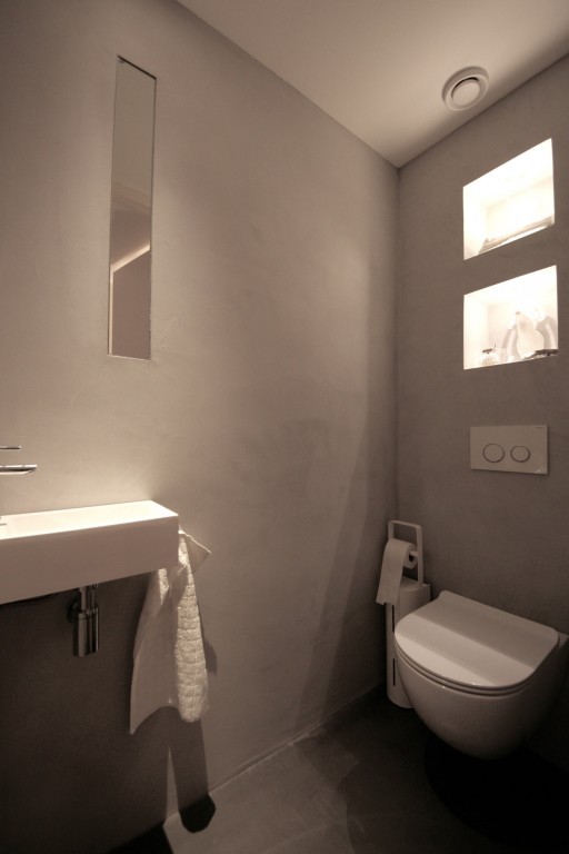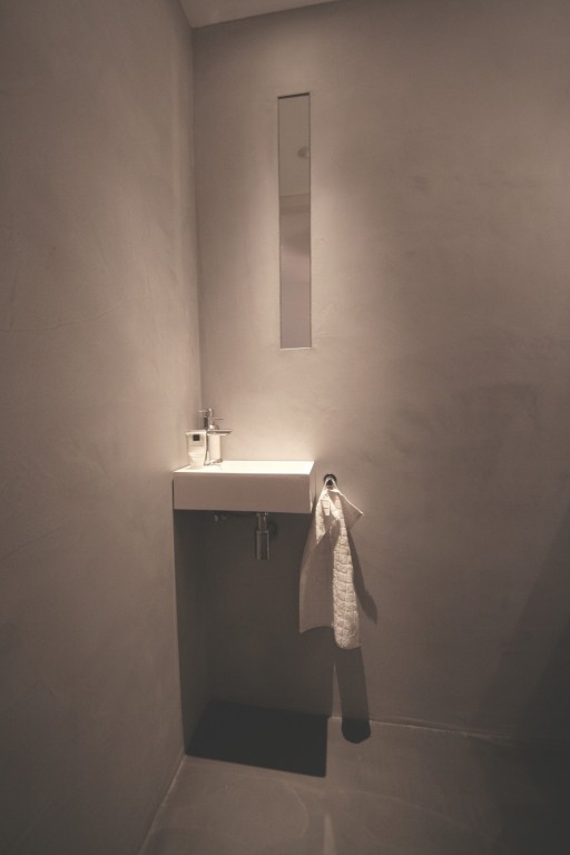 Badkamer, toilet en entree vloer afgewerkt met beal mortex betonlook.